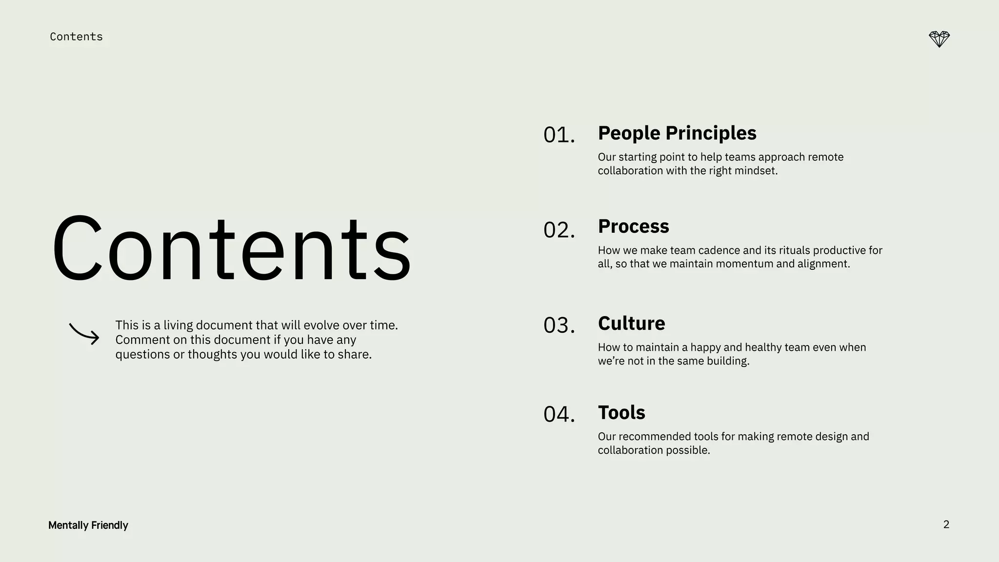 This document serves as a comprehensive guide for enhancing productivity in remote teamwork through principles, processes, culture, and tools. It emphasizes the importance of maintaining team momentum, effective communication, and the establishment of structured rituals for remote collaboration. The guide offers insights on overcoming common challenges faced by teams working remotely while promoting a healthy and engaging work environment.