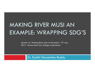 The seminar held by Dr. Donthi Narasimha Reddy on July 15, 2017, focused on the significance of the Musi River basin and its connection to Sustainable Development Goals (SDGs), emphasizing the urgent need for integrated management amidst rising pollution and water demand. It highlighted the environmental challenges faced by the river, including sewage contamination and poor water quality, while suggesting a comprehensive approach for restoration, pollution management, and public participation. Recommendations for rejuvenation included establishing a Musi River Basin Authority and implementing strict pollution control measures to safeguard the river's health and improve local livelihoods.
