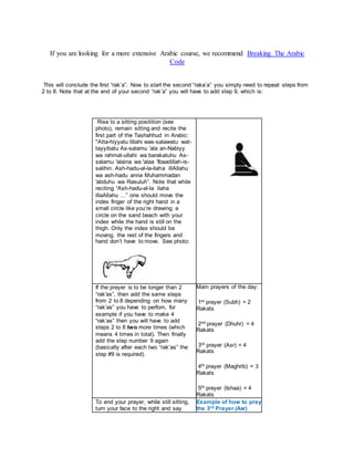 1. The document provides step-by-step instructions for performing Islamic prayers, known as salat. It describes the order of movements and supplications for the five daily prayers: Subh, Dhuhr, Asr, Maghrib, and Ishaa.