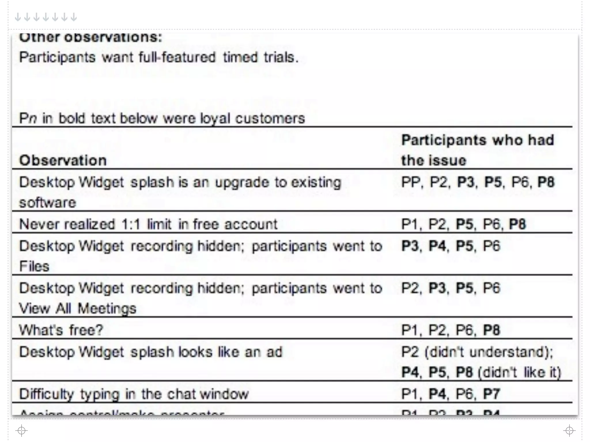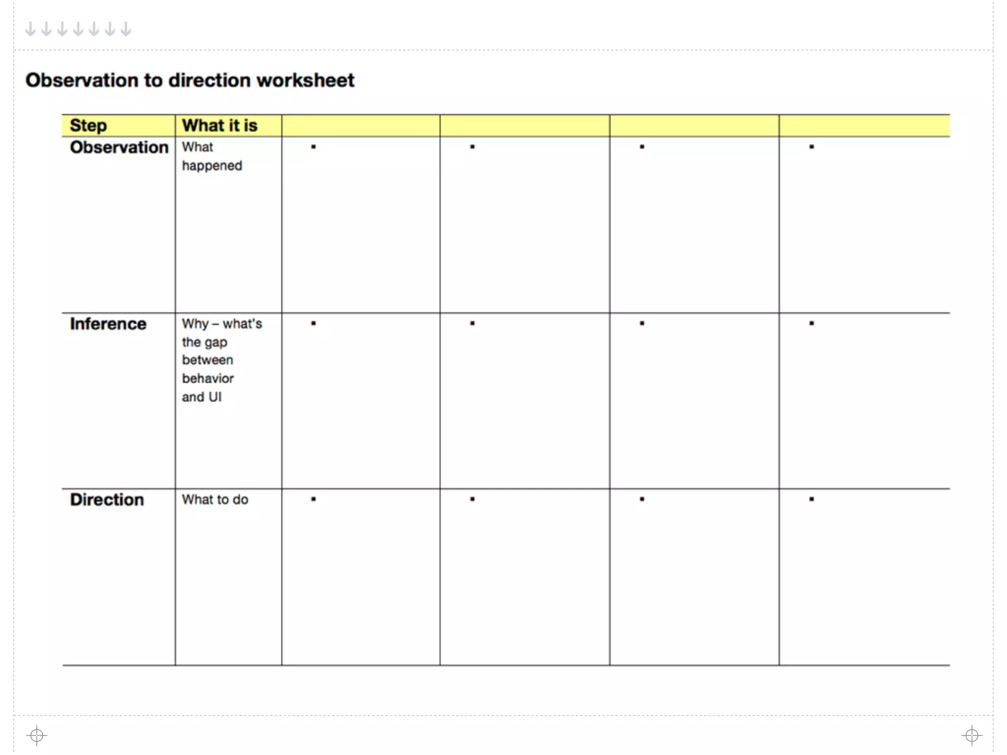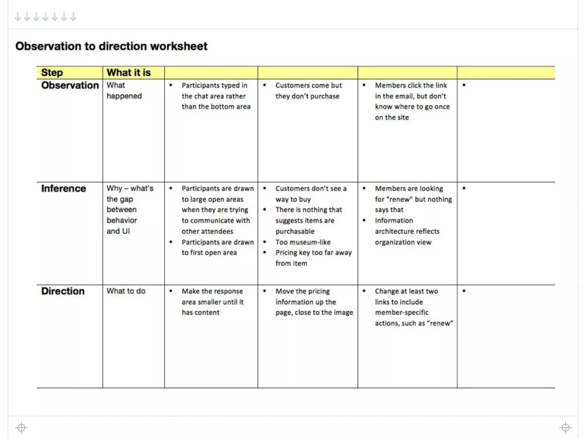 The document describes techniques for collaboratively analyzing observations to identify priorities and make sense of data. It discusses rolling issues lists where observers contribute in real time to identify issues. Personas are modeled using an A3 framework focusing on attitude, aptitude and ability. The observation-inference-direction framework is presented for analyzing data by moving from what was observed to inferences about why there is a gap and then directions for potential solutions. Democratic techniques like KJ analysis are proposed for building consensus around priorities from subjective data.