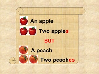 The document outlines 5 rules for making singular nouns plural in English: 1. Most words form the plural by adding -s. 2. Words ending in -ch, -sh, -x, -ss, or -o add -es. 3. Words ending in a consonant + -y drop the -y and add -ies. 4. Words ending in -f or -fe drop the -f and add -ves. 5. There are some irregular plurals like man/men and child/children.