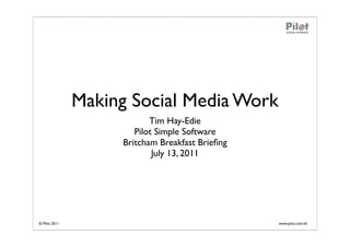 The document discusses strategies for using social media, including objectives like brand building, lead generation, sales, and customer service. It provides examples of how different companies like Britcham, PoshPile, Meguiar's, Timeout.com.hk, PacSafe.com, and TwoSteps.com utilize platforms like Twitter, Facebook, YouTube, and LinkedIn as part of their social media strategies. Key points covered include developing business objectives, analyzing return on investment for different strategies, and using analytics to measure performance.