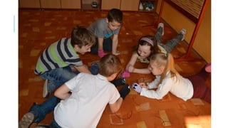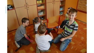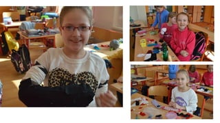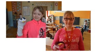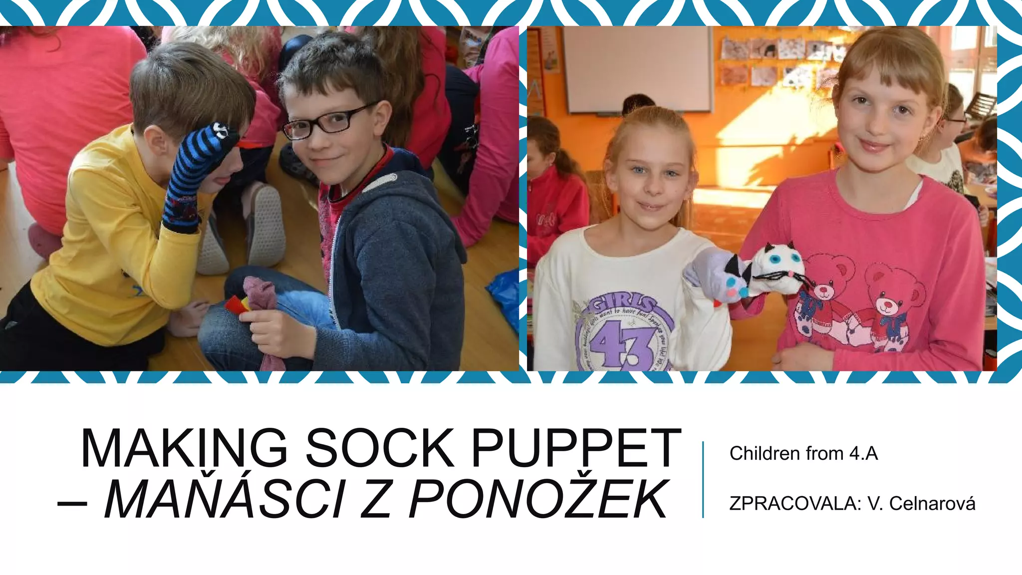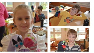 The students in class 4.A made sock puppets by cutting out geometric shapes from felt fabric for the puppets' features and gluing them on, such as eyes, ears, tongues, teeth and hair. Some students tried sewing with needles as well. They worked on the puppets during breaks and had fun cooperating and helping each other. The finished puppets were used to act out and play games. Additional accessories like food and toys were also made for the puppets.