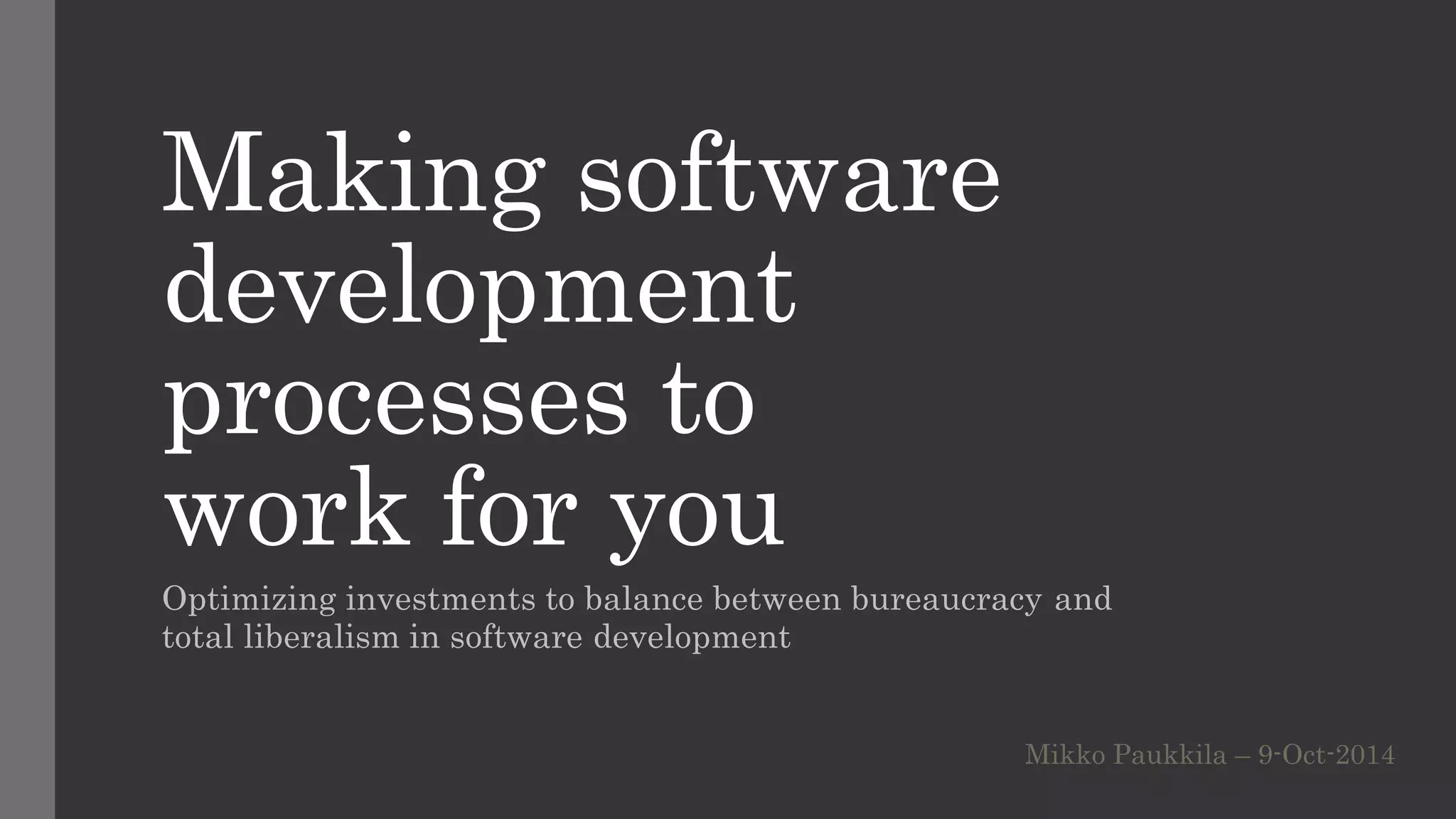 Mikko Paukkila discusses optimizing software development processes to balance bureaucracy and flexibility. He advocates for continuous integration to find errors early and speed up feedback loops. Tools like Git, Jenkins, Gerrit enable CI by automating builds, testing and code reviews. Process optimizations include reducing time from change to product, automating more tests, and ensuring developers have easy environments and fast feedback. The goal is enabling smooth development flows from needs to requirements to changes to high quality products.