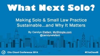 This document summarizes the agenda and key topics for the Clio Cloud Conference 2014 held in Chicago, Illinois from September 22-23, 2014. The conference focused on how technology has transformed and disrupted the legal profession, moving practices to the cloud and lowering costs. Specific sessions examined how solo and small law firms can become more sustainable and profitable through structural changes like subscription services, diversifying services, and changing outdated ethics rules around client trust accounts and advertising.