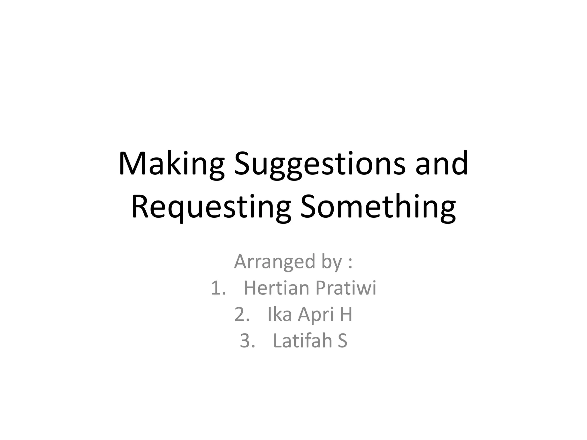 This document provides examples of language for making suggestions and requests in English. It includes phrases for making suggestions such as "Let's...", "How about...", "Why don't we...", and "Shall we..." as well as responses like "That's a good idea." For requests, it lists polite phrases using "Could you...", "Can you...", "Would you...", and "Will you..." followed by "please" along with potential responses like "Okay", "Of course", and "Yes, I will." The document aims to expand English vocabulary for making suggestions and requests.