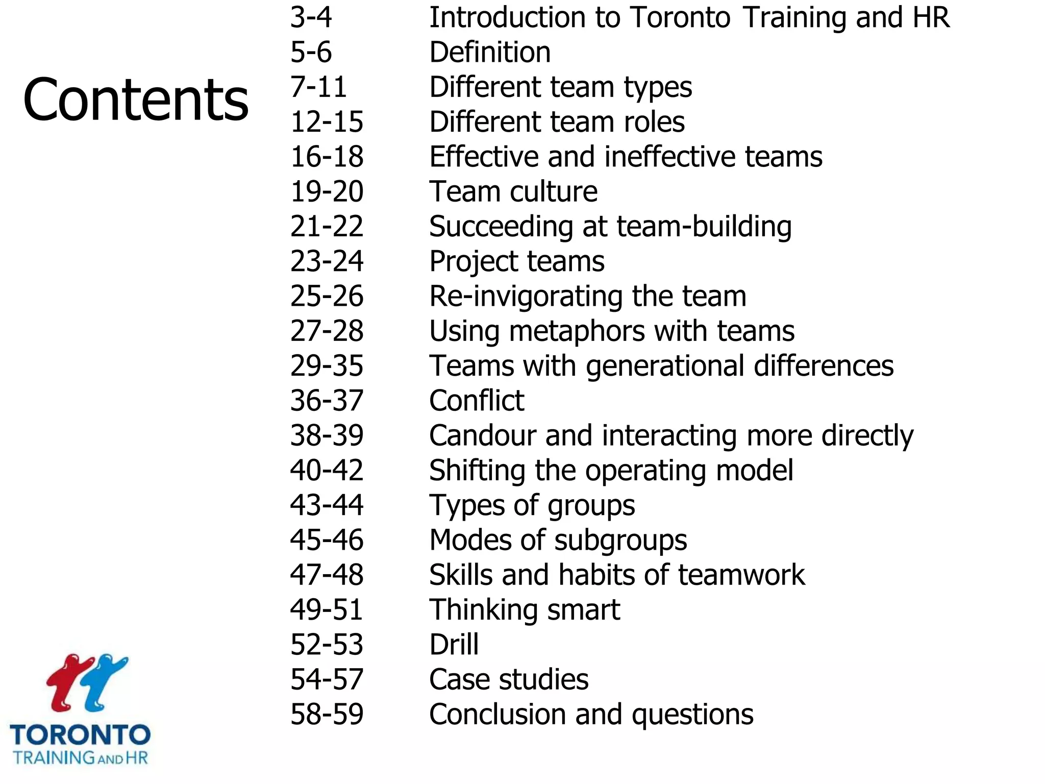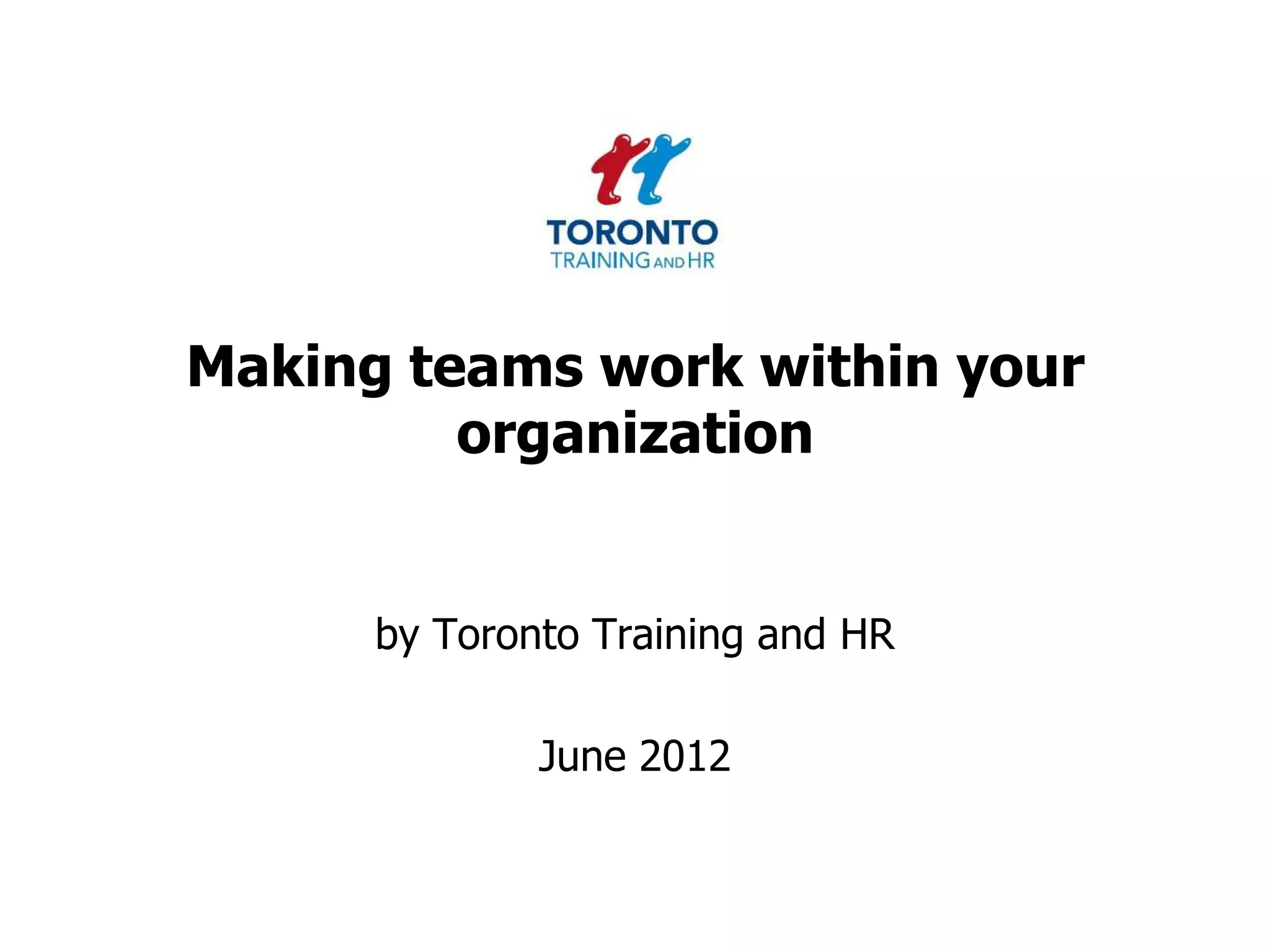 Toronto Training and HR provides training and consulting services to help organizations improve teamwork. The document discusses different types of teams, roles within teams, factors that make teams effective or ineffective, and how to build a positive team culture. It also provides tips on topics like using metaphors, managing generational differences, addressing conflict, and shifting operating models to improve collaboration. The goal is to help organizations maximize team performance and better leverage the skills and talents of all employees.