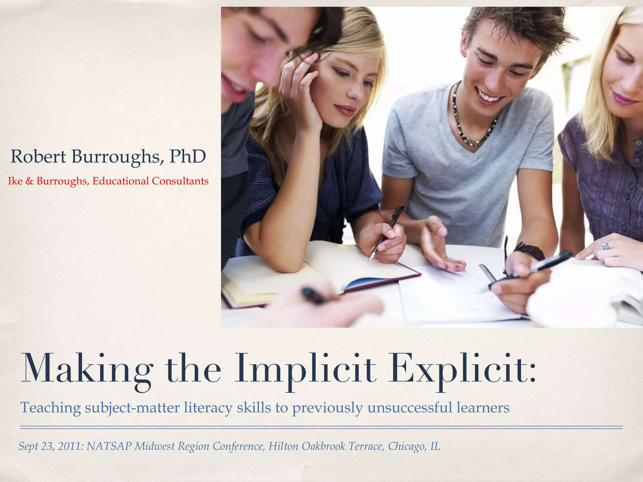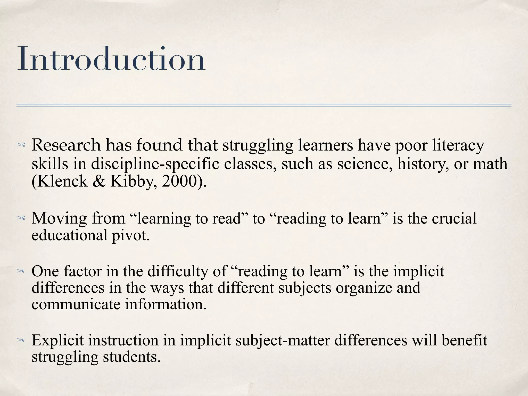 The document discusses the importance of teaching subject-matter literacy skills to struggling learners, emphasizing that understanding different academic disciplines' structures can enhance comprehension. It highlights that explicit instruction in these differences, such as vocabulary and text organization, is essential for students transitioning from 'learning to read' to 'reading to learn.' The document also provides sample activities and approaches for effectively teaching discipline-specific literacies.