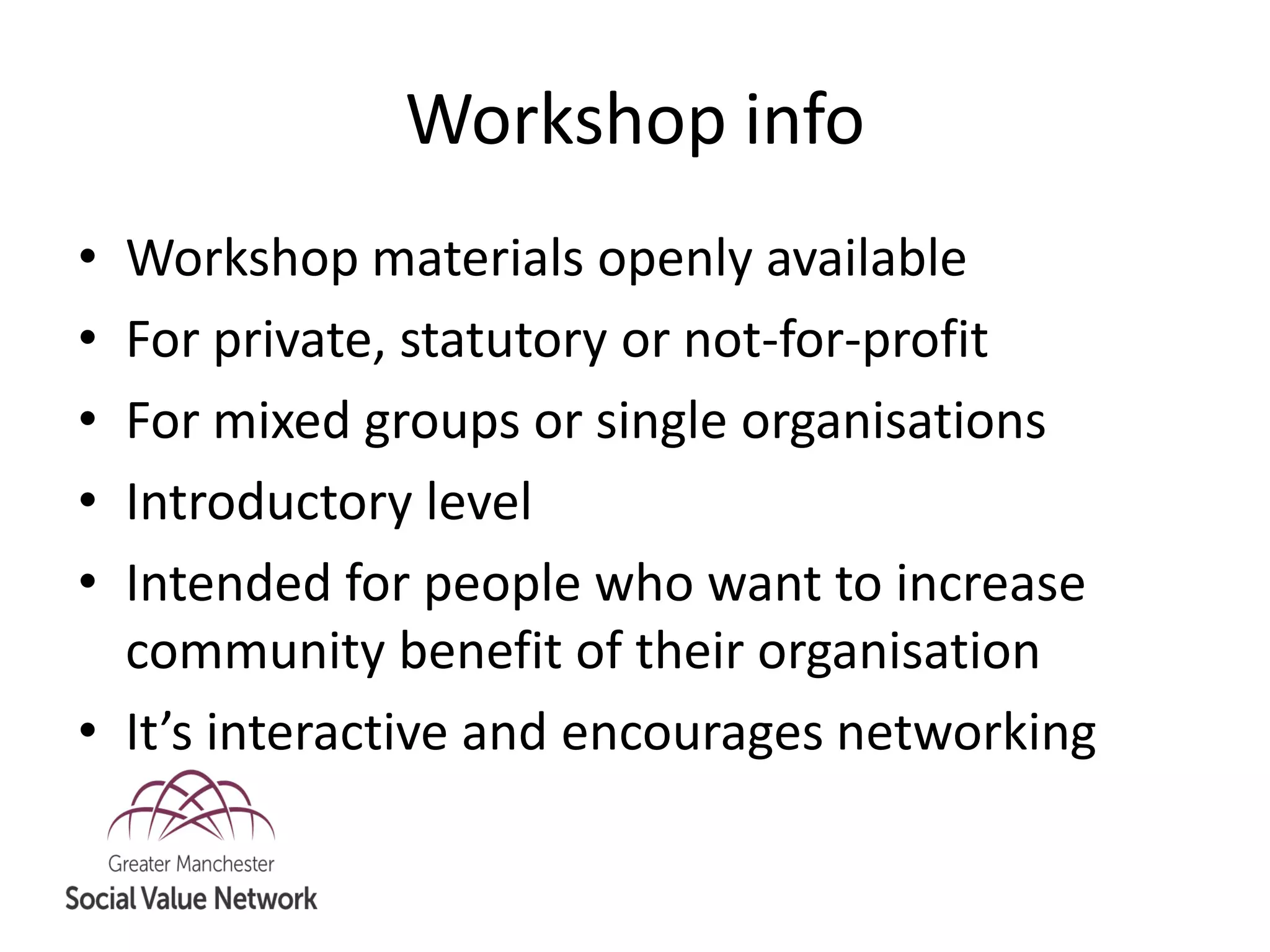 The document outlines a half-day workshop focusing on social value approaches for organizations aiming to enhance community benefits. Participants will learn about social value definitions, legislative frameworks, and engage in group exercises to develop action plans. The workshop is open to various organizational types and promotes networking while encouraging practical applications of social value principles.