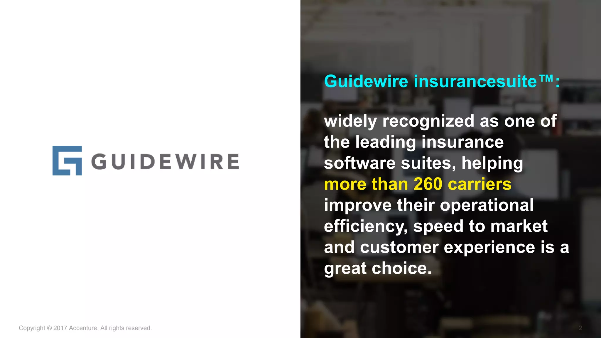 The document discusses Accenture's partnership with Guidewire, emphasizing their expertise in the implementation, integration, and support of Guidewire software for insurance carriers. It highlights successful case studies illustrating improved operational efficiency and cost reductions for clients, as well as the comprehensive tools and methodologies Accenture employs to ensure smooth and effective deployments. Accenture positions itself as a leading partner for insurers looking to maximize the benefits of their Guidewire applications.