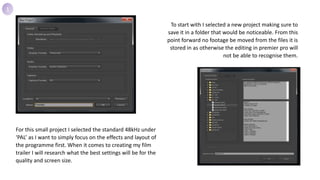 1. The document describes the process of creating a preliminary trailer experimenting with Adobe Premier Pro. Various editing techniques were used including adjusting clip speeds, adding titles, color corrections, and transitions.