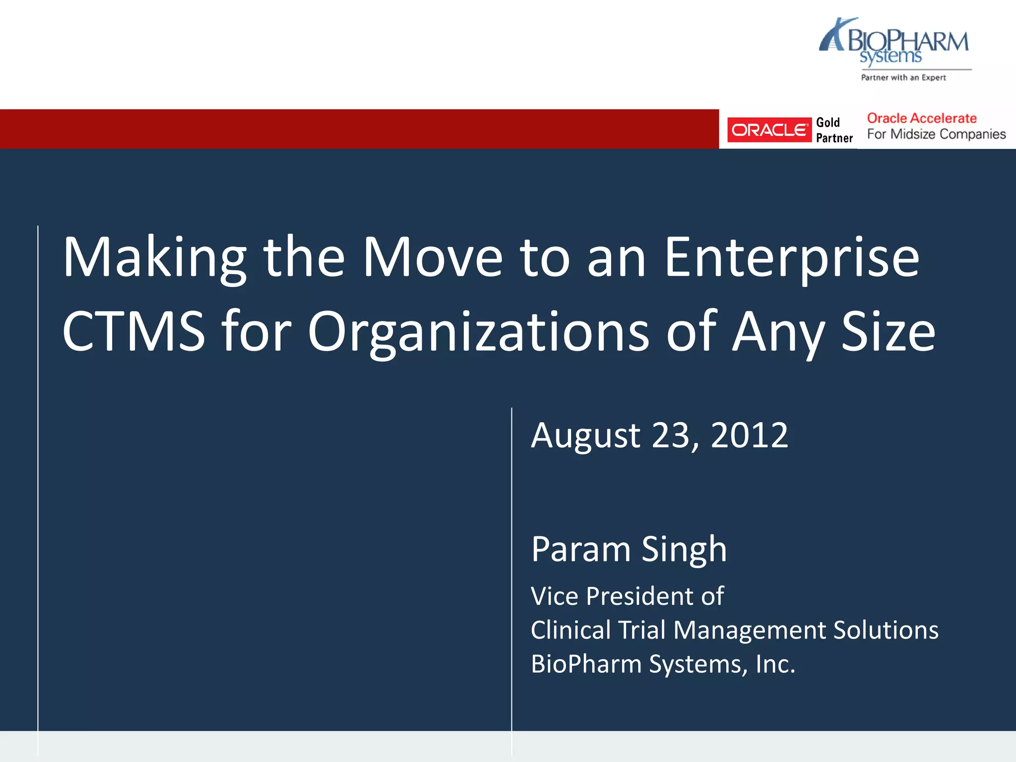 The document discusses making the move to an enterprise clinical trial management system (CTMS) for organizations of any size. It outlines key indicators that a CTMS is needed, such as rapid growth, increased trial complexity, and a desire for real-time data integration. An internal analysis of current processes and identification of stakeholders and requirements is recommended. Selection considerations include system performance, customization options, and integration capabilities. The conclusion emphasizes analyzing needs, obtaining funding approval, and choosing a system and implementation partner carefully.