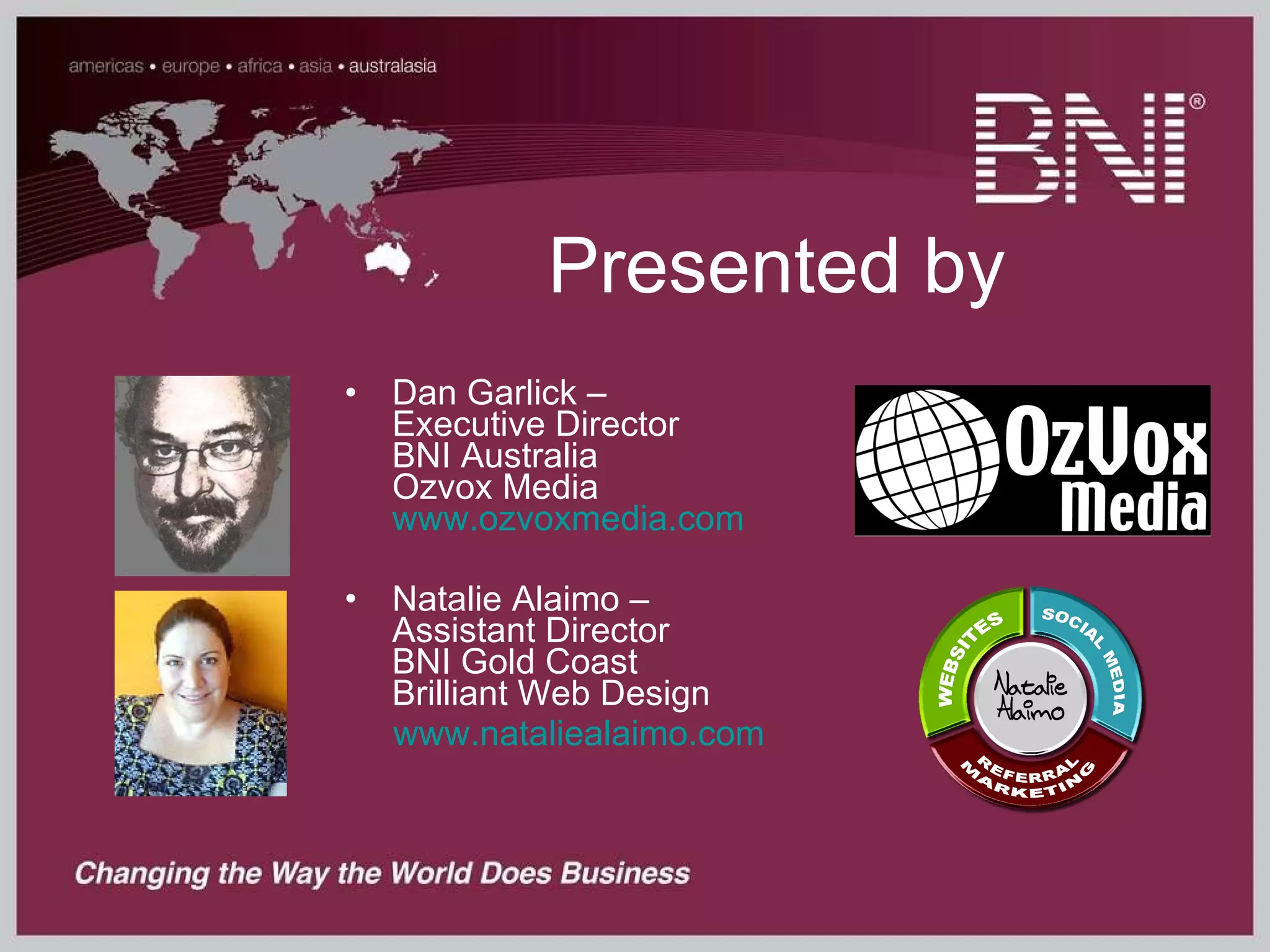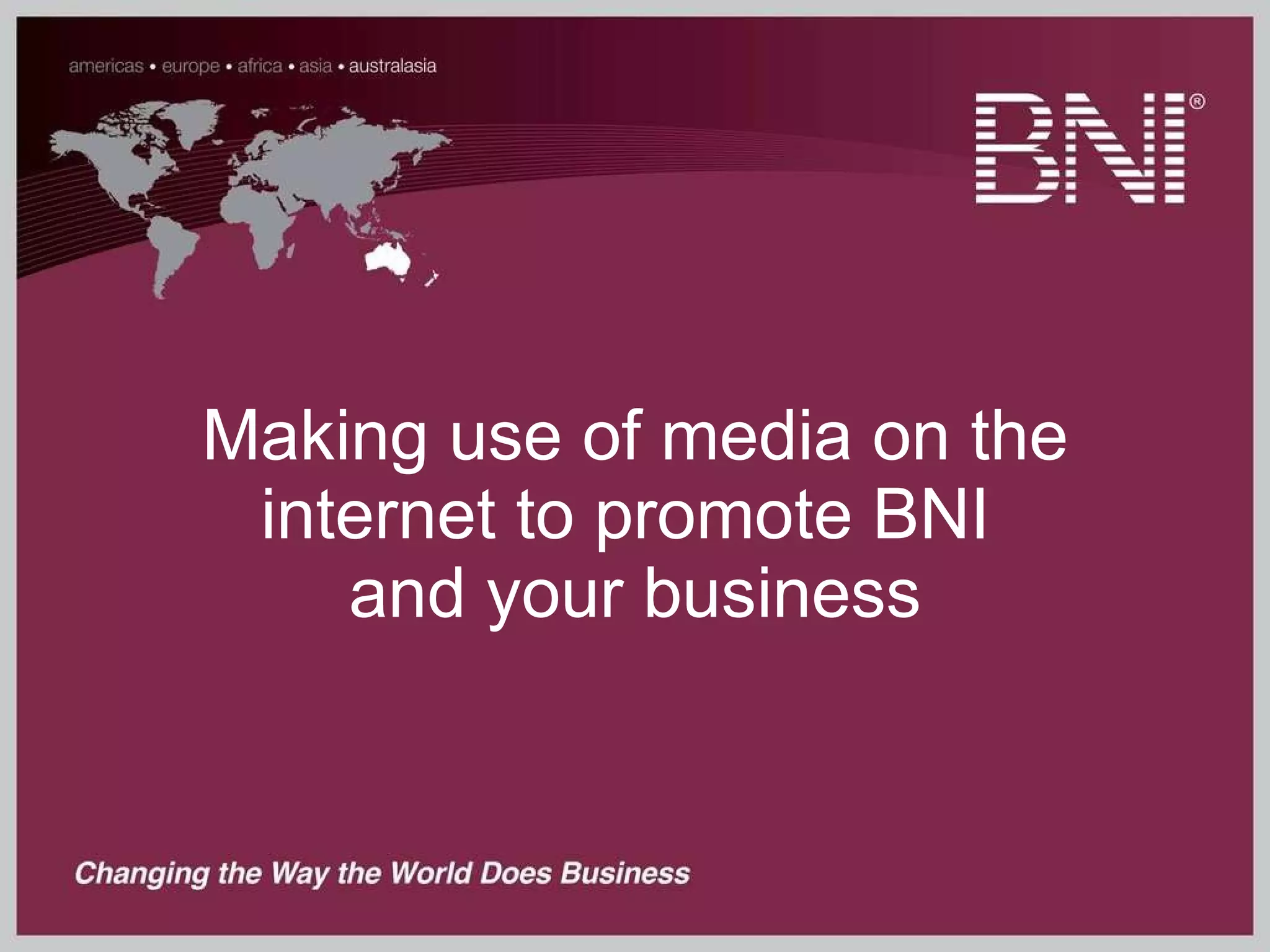 The document discusses using various media platforms on the internet to promote businesses and BNI. It outlines different types of media that can be used including written, video, audio, and visual content. It then discusses specific tools and platforms like Facebook, YouTube, Twitter, and blogs that can be used and tips for an effective social media strategy including focusing on a few key platforms and positioning yourself as an expert.
