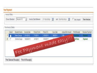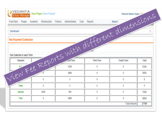 Vedanta School Software aims to bring efficiency, accuracy, and transparency to educational institutes through a fully integrated software product. The software automates all school operations from a single window, improves productivity through alerts and automated emails, and stores information centrally with zero redundancy. It covers the entire student lifecycle from enquiry to graduation and exit, including modules for academics, finance, infrastructure, fee and salary management, and more. The software provides a complete student information system with role-based dashboards and aims to make management easy while saving money for schools.