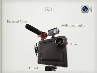 This document provides guidance on basic principles for creating videos using mobile devices. It discusses planning the narrative, preparing for shooting by checking device settings and available equipment, focusing on sound quality and framing shots, adjusting exposure during filming, reviewing and editing clips, and sharing the finished video. It also lists some free video editing apps and provides links to additional resources on mobile movie making.