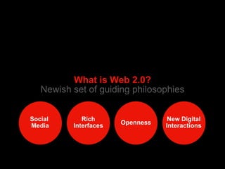 The document discusses the concept of Web 2.0, highlighting its guiding philosophies and the shift towards rich interfaces in digital interactions. It emphasizes user expectations for instant feedback, faster processes, and flexibility in online experiences, alongside various examples and implications for website design. The document also explores opportunities for integrating social media and collaborative content to enhance user engagement and simplify complex tasks.