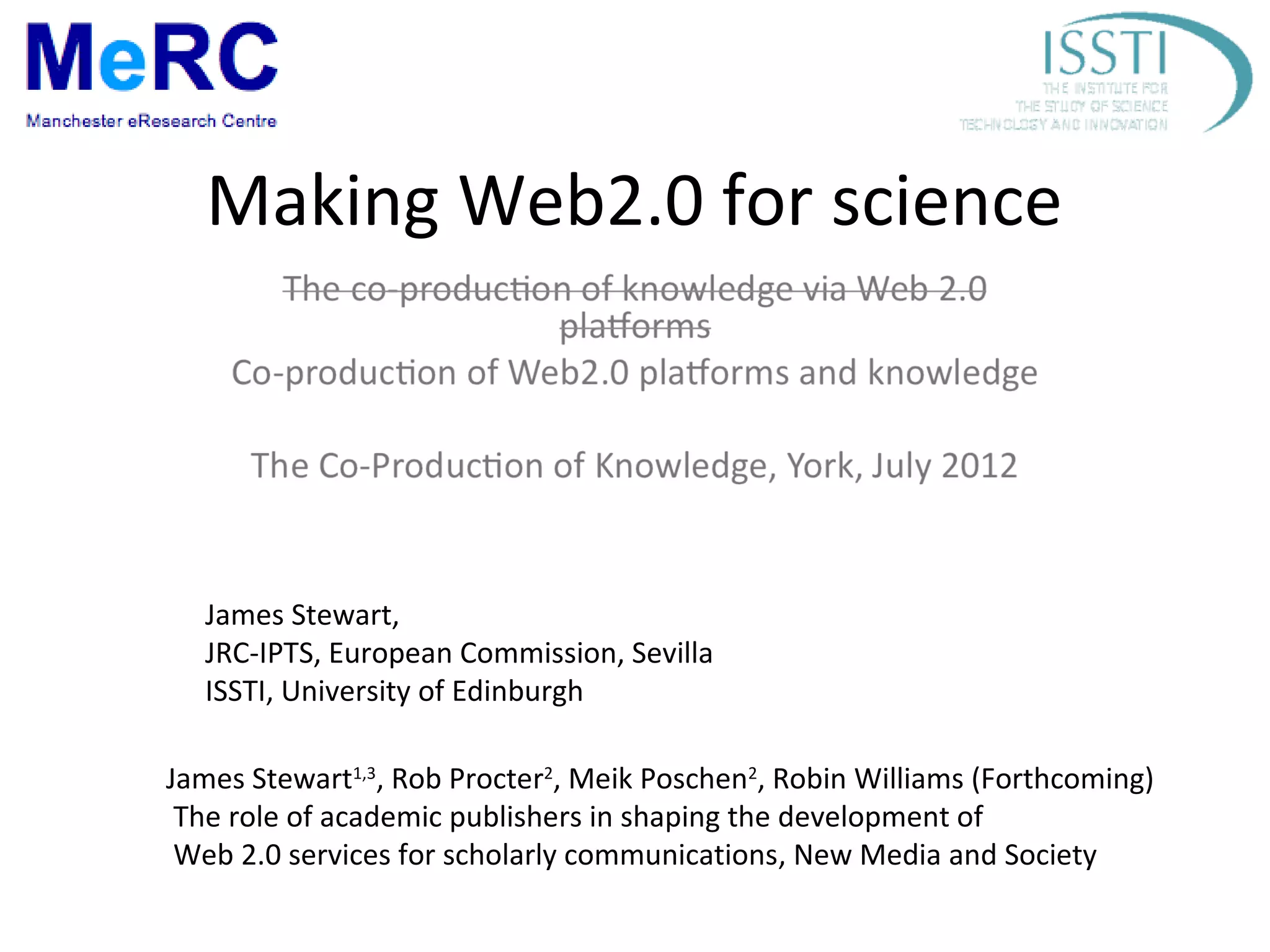 The document discusses the evolving role of web 2.0 in scholarly communications, emphasizing the impact of user-generated content and collaborative efforts facilitated by academic publishers. It highlights a multi-method study examining publishers like NPG and PLOS as both intermediaries and innovators in the development of web 2.0 services for scholarship. The findings reveal that while adoption is still nascent among scholars, publishers are crucial in shaping the web 2.0 landscape through experimentation and adaptation to enhance scholarly communication.