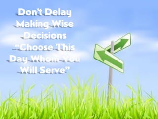 This document discusses the importance of making wise decisions by choosing to follow God and his principles. It states that our decisions determine our destiny, and that choosing obedience to God or rebellion will have major consequences. It provides biblical examples of both wise and unwise decisions, and encourages embracing wisdom, understanding, and fear of the Lord. It addresses applying biblical principles to decisions around role models, friends, education, career, and more. The overall message is that listening to God and his counsel leads to safety, while rejecting his wisdom results in destruction.