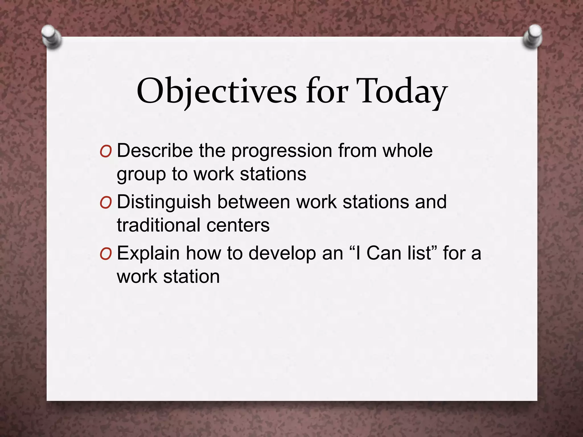 Work stations are differentiated literacy activities that remain set up all year, focusing on specific skills taught through whole group instruction, modeled by the teacher, and then practiced in small groups or independently. They differ from traditional centers which typically change weekly and have limited ability to meet student needs. Developing an "I Can" list for each station outlines the activities students can do independently using student-friendly language.