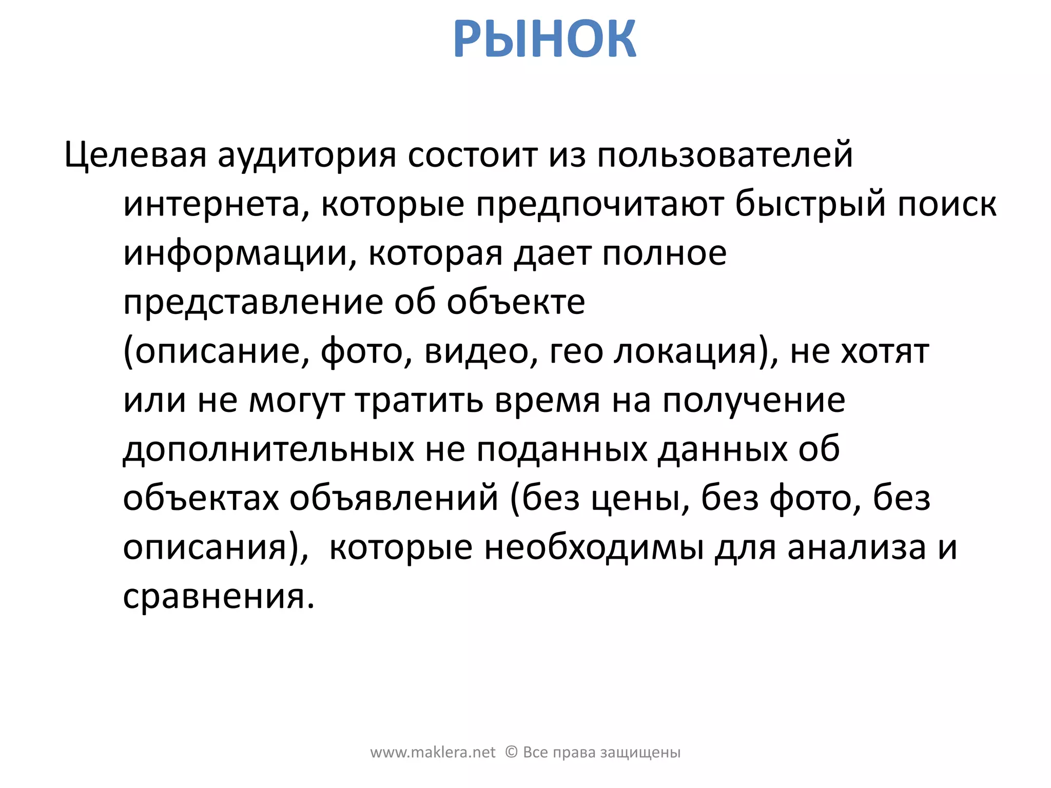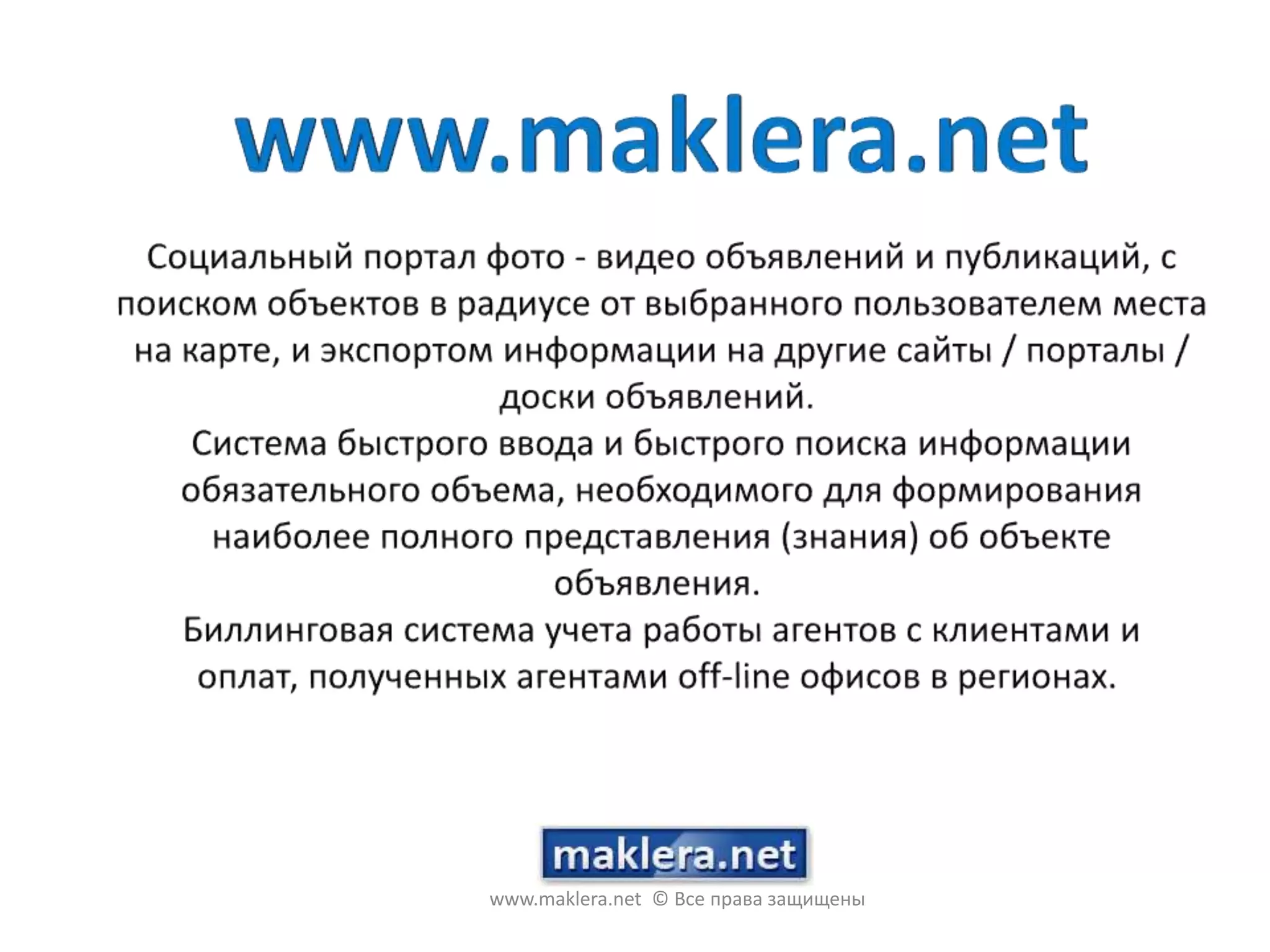 Документ описывает портал www.maklera.net, который предоставляет услуги поиска и размещения объявлений, включая недвижимость и автотранспорт, с акцентом на качественный контент и видео материалы. Основные функции включают систему быстрого поиска, биллинговую систему для агентов и методику привлечения клиентов через рекламу. Проблема, которую решает проект, заключается в недостатке информации в целевой аудитории, а также его бизнес-модель базируется на платных объявлениях и доле дохода от продажи объектов через offline-офисы.