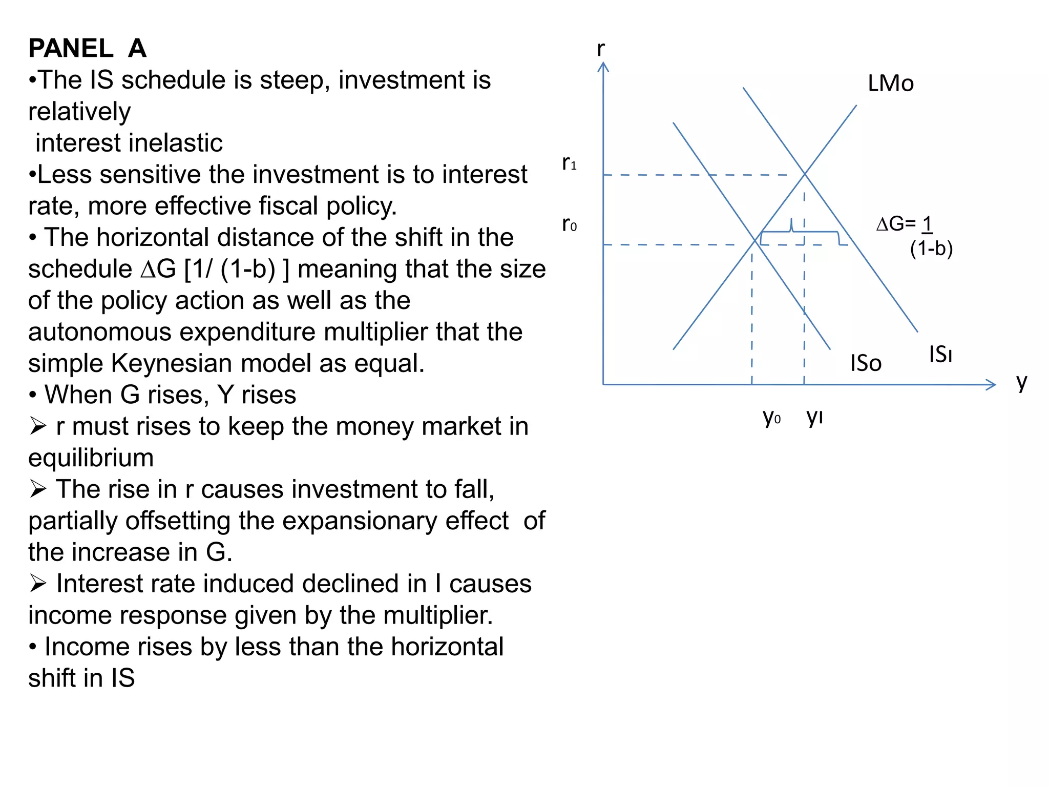 This document discusses the effectiveness of fiscal policy using the IS-LM model. It shows how an increase in government spending shifts the IS curve to the right. The degree of effectiveness depends on the slope of the IS curve, with a steeper curve indicating lower interest rate elasticity of investment. A steeper IS curve means fiscal policy has a greater impact on output as less crowding out of investment occurs from rising interest rates. The document demonstrates this concept through three panels showing different IS curve slopes.