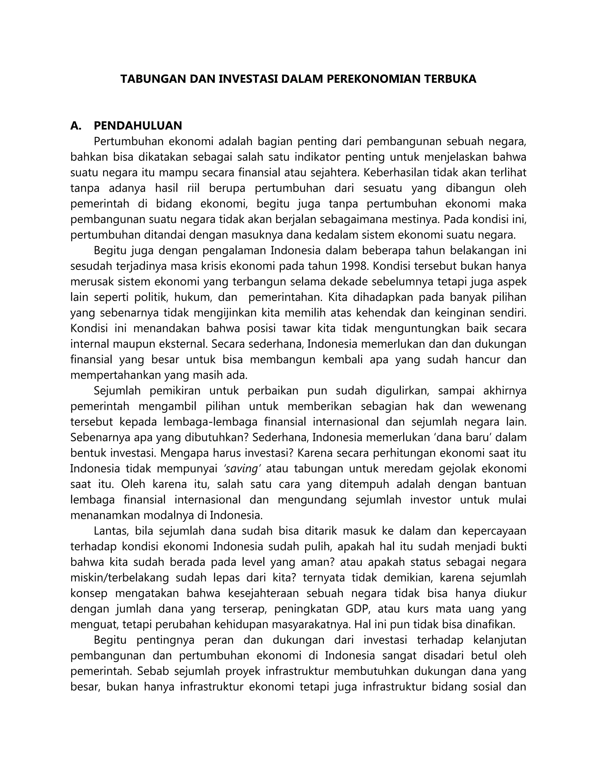 Dokumen tersebut membahas pentingnya tabungan dan investasi dalam perekonomian Indonesia. Indonesia membutuhkan modal baru berupa investasi asing karena kekurangan tabungan domestik untuk pemulihan ekonomi pasca krisis 1998. Pemerintah berupaya meningkatkan iklim investasi dengan kebijakan seperti Inpres Nomor 3/2006 tentang perbaikan iklim investasi dan promosi ke negara investor. Investasi asing sangat dibutuhkan untuk proyek infrastruktur dan pertumbuhan ekon