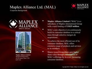Maplex Alliance Ltd (MAL) is a subsidiary of Maplex International Group, established in 2009 with $25 million in seed funding, focused on building a consumer database through mergers and acquisitions. MAL aims to transform from a consumer shareholding strategy to a financial institution by combining its merger and acquisition experiences with financial knowledge. The company also offers various products, services, and incentives to encourage member participation and financial growth.