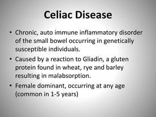 Celiac disease is an autoimmune disorder caused by a reaction to gluten, resulting in damage to the small intestine and malabsorption. It is characterized by the absence of intestinal villi and infiltration of lymphocytes into the epithelium. Symptoms include diarrhea, abdominal pain, and malnutrition. Diagnosis is confirmed via small bowel biopsy showing damage to intestinal villi. Treatment requires strict lifelong adherence to a gluten-free diet. Whipple's disease is a rare infection caused by a bacterium that infiltrates the small intestine, causing macrophages to obstruct lymphatic drainage and resulting in malabsorption. It commonly affects the joints and brain and is treated with intravenous antibiotics. Both conditions can lead to complications due to severe vitamin and