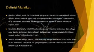Malaikat digambarkan sebagai makhluk ghaib yang diciptakan oleh Allah dari cahaya. Mereka tidak memiliki sifat keilahian dan selalu taat kepada perintah Allah. Jumlah malaikat sangat banyak meskipun hanya Allah yang mengetahuinya. Malaikat diyakini memiliki jasad besar dan sayap, termasuk Malaikat Jibril yang memiliki 600 sayap. Malaikat Maut diberi tugas mengurusi kematian dengan kekuatan besar yang