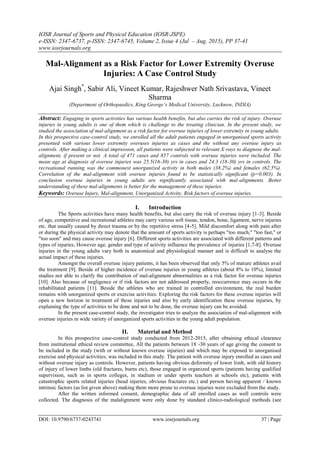 This study examined the association between mal-alignment and lower extremity overuse injuries in young adults engaged in unorganized sports activities. The study included 471 cases with overuse injuries and 857 controls without injuries. Mal-alignment was assessed clinically and radiographically. The most common unorganized activity was recreational running. A statistically significant correlation was found between mal-alignment and overuse injuries (p=0.003). The study concluded that overuse injuries in young adults are significantly associated with mal-alignments.