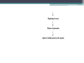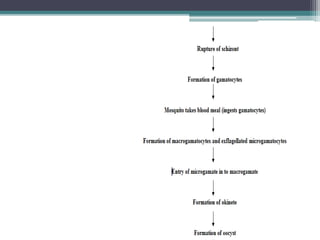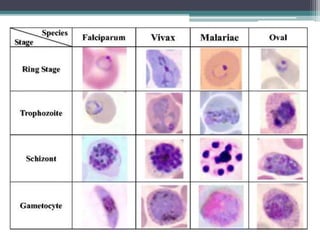 Malaria is a life-threatening disease caused by parasites transmitted through mosquito bites, infecting 219 million people in 2017 and killing 435,000. There are four types of malaria parasites, with P. falciparum causing the most deaths. The disease is most prevalent in Africa, Asia, and South America. Symptoms include fever, chills, and flu-like illness, with risks greatest for young children, pregnant women, and those with weak immune systems. Treatment depends on the type and severity of malaria, but may include chloroquine, primaquine, artemether, and doxycycline to kill the parasites. Prevention involves mosquito nets, repellents, and in some cases antimal