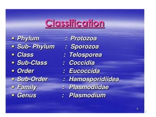 The document provides a detailed overview of malarial parasites, focusing on the genus Plasmodium, particularly P. falciparum. It includes descriptions of the life cycle, gametocytogenesis, clinical symptoms, pathogenesis, and the historical timeline of malaria research and treatment. The document emphasizes the pathogenicity of P. falciparum, its virulence mechanisms, and the pathological changes it induces in various organs.