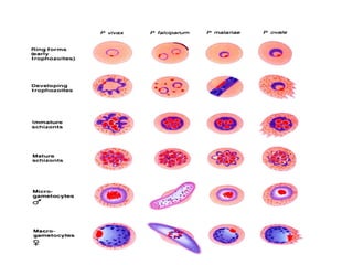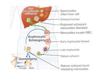 The document details a case of malaria in a 48-year-old male, highlighting symptoms like high fever, chills, and profuse sweating, and discusses the causative agents including Plasmodium vivax and Plasmodium falciparum. It outlines the complex life cycle of the parasite, clinical features, pathogenesis, types of malarial fever, and potential complications of falciparum malaria. Additionally, it describes laboratory diagnostic methods and the recommended treatments for both vivax and falciparum malaria, along with prevention strategies.