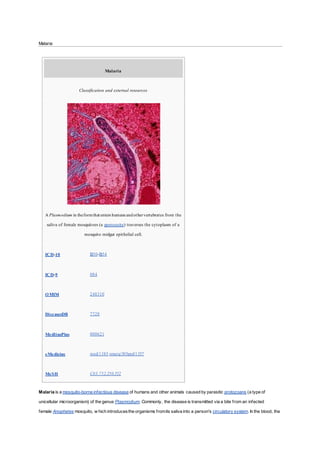 Malaria is a mosquito-borne infectious disease caused by parasitic protozoans of the genus Plasmodium. It is transmitted via the bite of an infected female Anopheles mosquito, which introduces the parasites into a person's bloodstream. The parasites travel to the liver to mature and reproduce before infecting red blood cells. Common symptoms include fever, headache, and in severe cases coma or death. There are five species that can infect humans but P. falciparum and P. vivax cause the majority of malaria cases and deaths worldwide, especially in sub-Saharan Africa and tropical regions.
