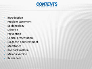 The document provides an overview of malaria epidemiology, prevention, and control efforts in India. It discusses that malaria affects millions of people annually in India, transmitted primarily by Anopheles mosquitoes. Key prevention strategies mentioned include vector control through indoor residual spraying and larviciding, and prompt diagnosis and treatment of cases. Major control programs launched over time aimed to reduce malaria incidence and mortality, through activities like active case detection, radical treatment, and insecticide spraying. National strategies have evolved from eradication to control efforts as challenges emerged.