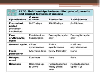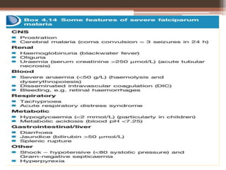 Malaria is caused by Plasmodium parasites, with P. falciparum being the most deadly. Clinical features of malaria include flu-like symptoms such as fever, fatigue, and muscle aches. Fever occurs in periodic paroxysms, with shivering, high fever, and sweating stages. Complications of severe falciparum malaria include cerebral malaria, hypoglycemia, acidosis, anemia, disseminated intravascular coagulation, liver dysfunction, pulmonary edema, and renal impairment. Cerebral malaria is the most important complication and a leading cause of death from malaria.