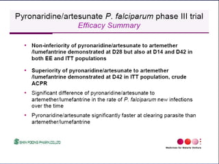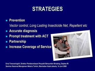 2) Prompt treatment with artemisinin-based combination therapy (ACT) is important but drug resistance is a growing problem.