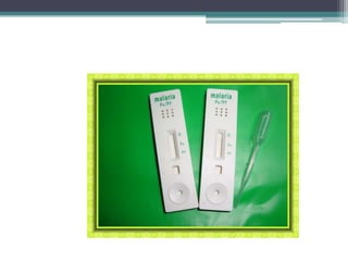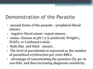 This document discusses the diagnosis of malaria through microscopic examination of blood smears. Peripheral blood smears can be used to identify the asexual forms of the malaria parasite. Thick blood smears are more sensitive for detection of low-level parasitemia but thin smears are needed for species identification. Rapid diagnostic tests are also used to detect malaria antigens but cannot identify the parasite species or quantify the level of infection. Clinical symptoms may also indicate malaria in endemic areas but laboratory confirmation is needed for accurate diagnosis.