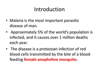 Malaria is a protozoan infection transmitted by mosquitoes that infects red blood cells. P. falciparum malaria can cause severe complications such as cerebral malaria, acute renal failure, pulmonary edema, liver dysfunction, hypoglycemia, and acidosis due to parasite sequestration in vital organs. Treatment involves antimalarial drugs like artesunate or quinine plus supportive care for organ dysfunction. Cerebral malaria requires airway control, anticonvulsants, treatment of hypoglycemia, and blood transfusion for severe anemia.