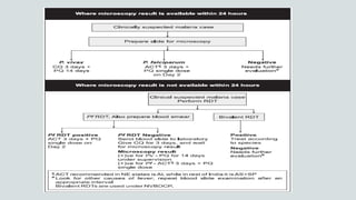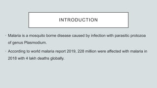 Malaria is a mosquito-borne disease caused by Plasmodium parasites. In 2018, 228 million people were infected globally resulting in over 400,000 deaths. India accounts for 3% of global malaria cases and deaths, with most cases concentrated in 7 states. Malaria is transmitted via the bites of infected female Anopheles mosquitoes. Symptoms include fever, chills, and flu-like illness, with P. falciparum infections potentially causing severe complications like cerebral malaria, severe anemia, or respiratory distress. Proper diagnosis and treatment are needed to prevent mortality from this widespread and potentially deadly disease.
