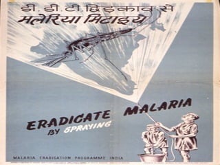 The document discusses the burden and history of malaria control efforts in India. It notes that in 2012, India reported over 1 million malaria cases and over 500 deaths. It outlines the various national malaria control programs from the Bhore Committee in 1946 to the current National Vector Borne Disease Control Program. Key strategies have included insecticide spraying, surveillance, diagnosis and treatment. Urban areas pose ongoing challenges, with the Urban Malaria Scheme currently covering 131 high burden towns.