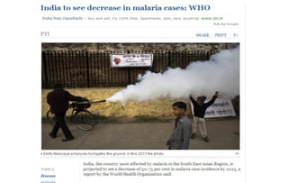 This document discusses malaria rapid diagnostic tests (RDTs). It explains that RDTs detect specific malaria antigens or proteins to identify if malaria parasites are present. There are three main types of antigens detected: HRP2, pLDH, and aldolase. RDTs are useful for diagnosis, case management, epidemiology, and screening donated blood. Their strengths are ease of use, rapid results, and not requiring refrigeration. Challenges include shorter shelf life and lower sensitivity than laboratory tests. Key factors for choosing an RDT are the Plasmodium species, accuracy, shelf life, ease of use, and cost. Guidelines recommend testing and monitoring RDT batches, manufacturer quality practices, cold chain transport