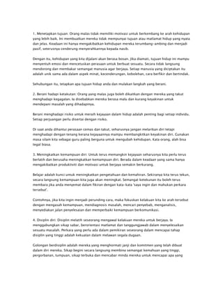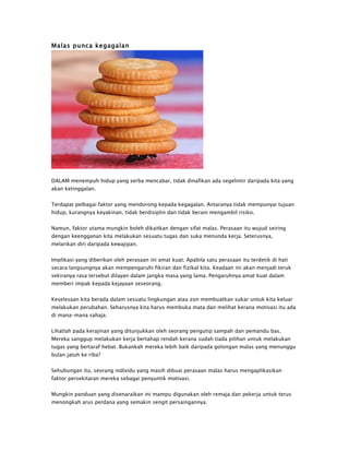 Dokumen ini membahas tentang punca kegagalan dalam hidup, di mana sifat malas menjadi faktor utama yang menghalang kejayaan seseorang. Penulis menyarankan pelbagai langkah seperti menetapkan tujuan, berani menghadapi ketakutan, meningkatkan kemampuan diri, disiplin, dan berada dalam lingkungan positif untuk mengatasi masalah malas. Dengan menerapkan prinsip-prinsip ini, individu diharapkan dapat mengubah sikap dan mencapai kejayaan dalam kehidupan.