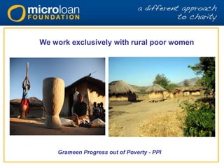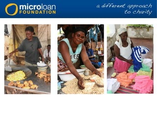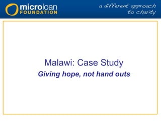 MicroLoan Foundation is a microfinance charity based in Malawi that provides small loans, bank accounts, business training, and mentoring exclusively to rural poor women. It has over 150 local staff serving more than 26,000 active clients across 21 branches in all 3 regions of Malawi, with a 98% repayment rate. One client, Joice, used loans to establish a grocery store and knitting business, increasing her weekly income from under £4 to over £30 and gaining independence to support her family of 8 children.