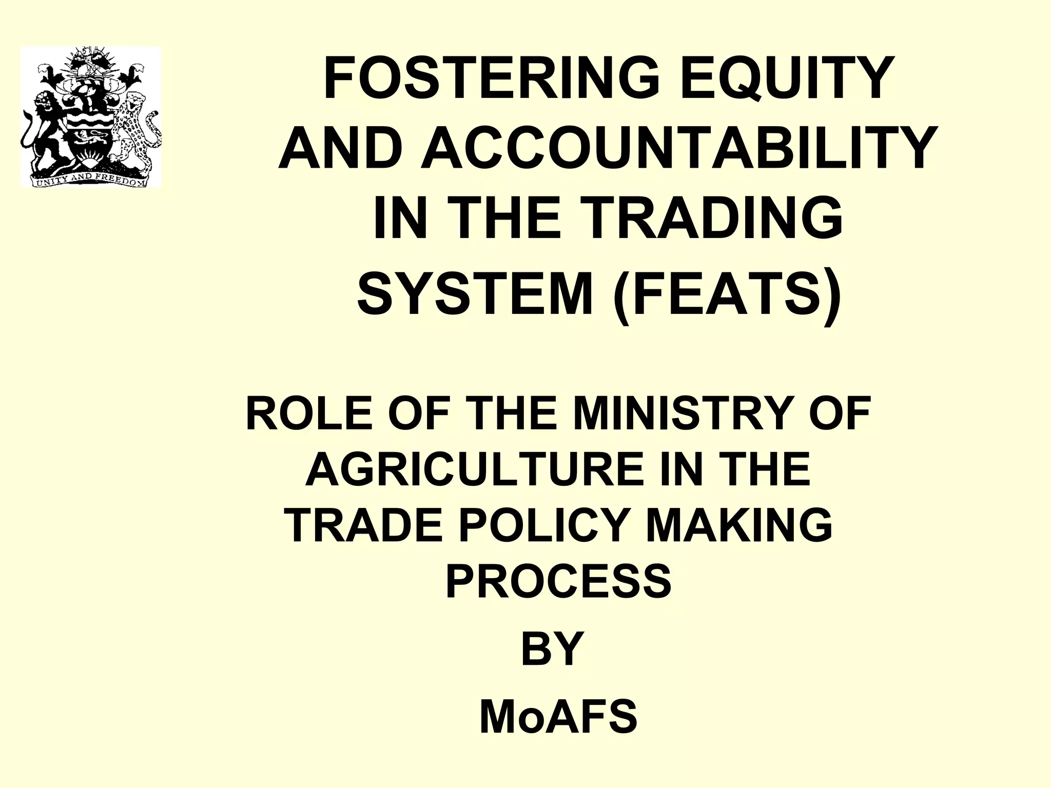 The document discusses the role of the Ministry of Agriculture (MoA) in Malawi's trade policy making process. It outlines the various trade policy institutions in Malawi and how the MoA is involved at different stages, including consultation during policy development, formulation and implementation. However, the MoA's level of involvement varies and it often has limited ownership over the process. The document recommends strengthening coordination between government institutions and increasing the MoA's capacity to play a more active role in trade policy making.