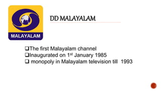 The document outlines the history of Malayalam television, highlighting its first channel initiated in 1985 and the rise of private channels beginning with Asianet in 1993. It details various news channels, their political affiliations, and notable personalities within the industry, emphasizing bias towards political ideologies. The document critiques the role of television in Kerala as a propaganda tool while noting some positive developments in the news landscape.