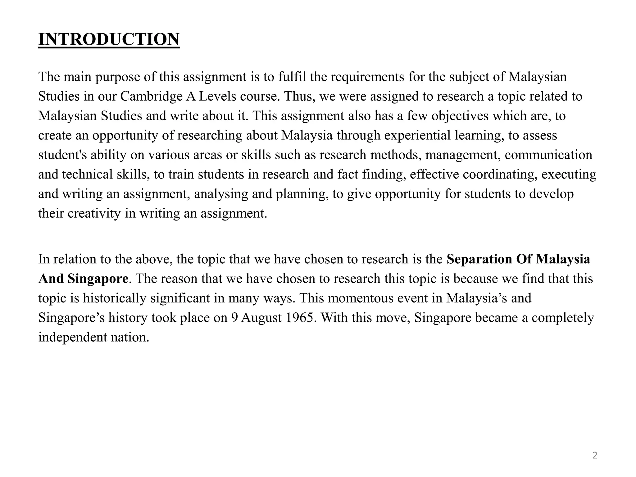 The document summarizes the key events surrounding the separation of Singapore from Malaysia in 1965. It discusses the formation of Malaysia in 1963 which included Singapore, Sarawak and Sabah joining the Federation of Malaya. However, political and racial tensions grew between the Chinese-majority PAP party in Singapore and the Malay-dominated Alliance party in Kuala Lumpur. This led to two major race riots in 1964. Faced with increasing unrest, the Malaysian parliament voted to remove Singapore from the federation in 1965, granting the island independence against the wishes of the PAP and Singapore's first prime minister Lee Kuan Yew.