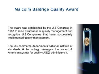 The Malcolm Baldrige Quality Award was established by Congress in 1987 to recognize U.S. companies that have successfully implemented quality management and raise awareness of the topic. It is managed by the National Institute of Standards and Technology and administered by the American Society for Quality. The award evaluates organizations on seven criteria related to leadership, strategic planning, customer and workforce management, and results. Applications are scored on a 1000 point system allocated across the various sections.