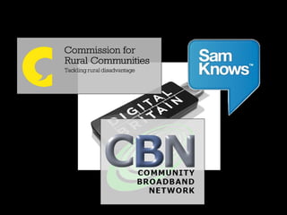 The document discusses the role of community-driven initiatives in the provision of broadband services across the UK, highlighting the work of organizations like Community Broadband Network and various local projects. It emphasizes the need for higher-speed broadband to support new services and the substantial investment required for next-generation access in underserved areas. The future of broadband is presented as one that relies on community engagement and innovative funding models to ensure all populations, including those in rural and economically challenged areas, can be connected.