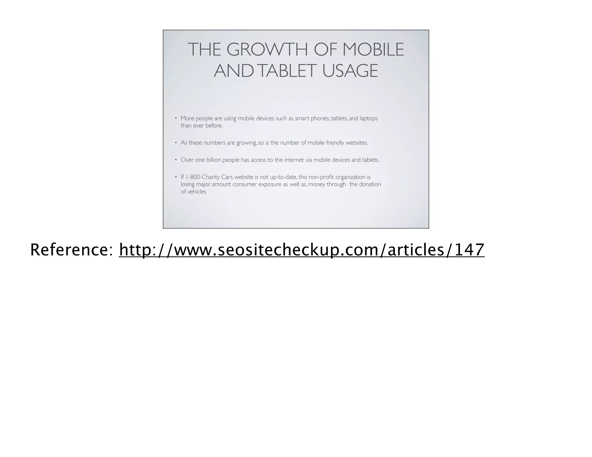 This presentation discusses the growing usage of mobile devices and importance of websites being accessible across devices. It outlines how over 1 billion people access the internet via mobile, and forecasts that number growing to 5 billion in the next 3-5 years. The presentation recommends non-profits like 1-800-Charity Cars create responsive websites that can adapt to any device, with design focused on mobile users, to ensure accessibility and continue receiving donations.